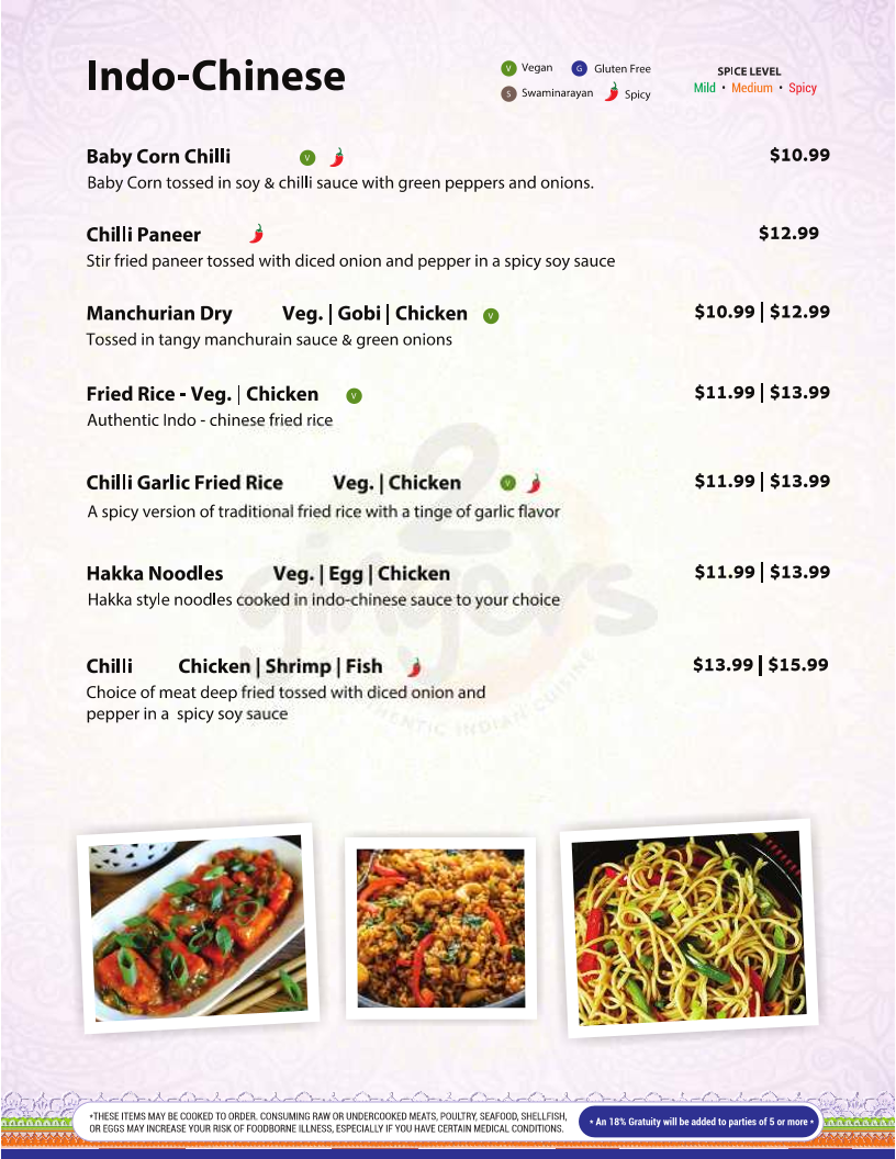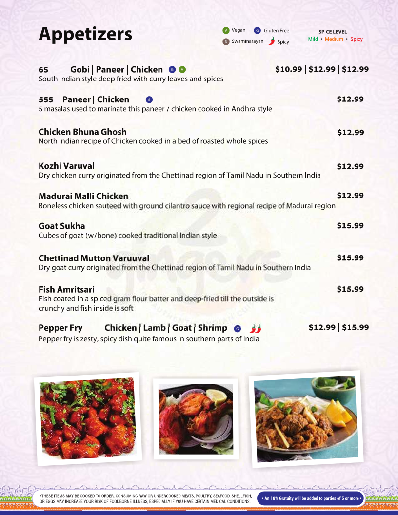 Crispy and spicy bites available in cauliflower, paneer, or chicken options.